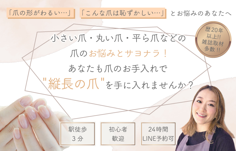 もしあなたも「爪の形を綺麗にしたい」「細くて美しい縦長の爪にしたい」とお悩みでしたら、当店にご相談ください。